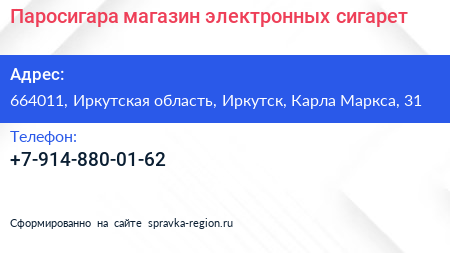 Паросигара, магазин электронных сигарет по адресу 664011, Иркутская область, Иркутск, Карла Маркса, 31 в дальнейшем Организация, размещена в следующих категориях: