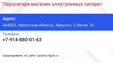 Паросигара, магазин электронных сигарет по адресу 664022, Иркутская область, Иркутск, 3 Июля, 35 в дальнейшем Организация, размещена в следующих категориях: