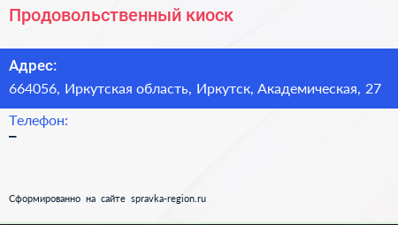 Продовольственный киоск по адресу 664056, Иркутская область, Иркутск, Академическая, 27 в дальнейшем Организация, размещена в следующих категориях: