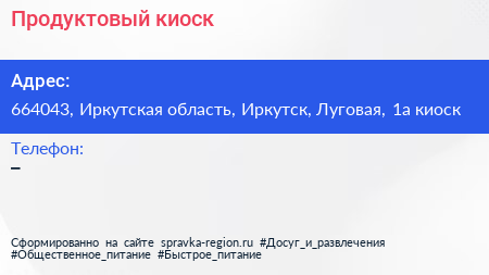 Продуктовый киоск по адресу 664043, Иркутская область, Иркутск, Луговая, 1а киоск в дальнейшем Организация, размещена в следующих категориях: