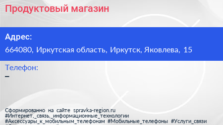 Продуктовый магазин по адресу 664080, Иркутская область, Иркутск, Яковлева, 15 в дальнейшем Организация, размещена в следующих категориях: