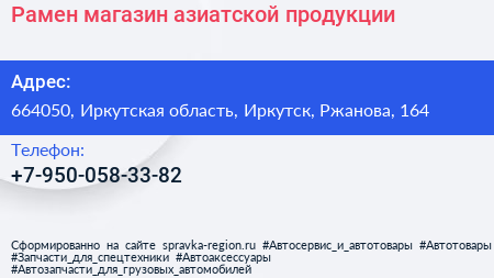 Рамен, магазин азиатской продукции по адресу 664050, Иркутская область, Иркутск, Ржанова, 164 в дальнейшем Организация, размещена в следующих категориях: