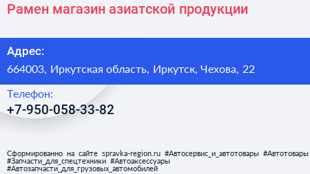 Рамен, магазин азиатской продукции по адресу 664003, Иркутская область, Иркутск, Чехова, 22 в дальнейшем Организация, размещена в следующих категориях: