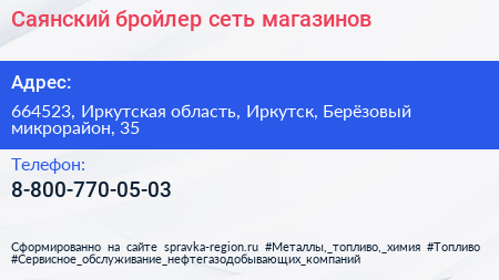 Саянский бройлер, сеть магазинов по адресу 664523, Иркутская область, Иркутск, Берёзовый микрорайон, 35 в дальнейшем Организация, размещена в следующих категориях: