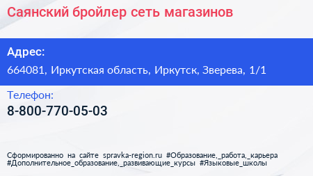 Саянский бройлер, сеть магазинов по адресу 664081, Иркутская область, Иркутск, Зверева, 1/1 в дальнейшем Организация, размещена в следующих категориях: