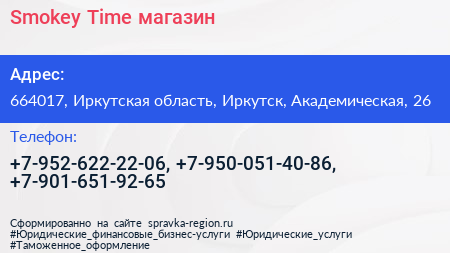 Smokey Time, магазин по адресу 664017, Иркутская область, Иркутск, Академическая, 26 в дальнейшем Организация, размещена в следующих категориях: