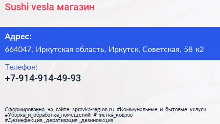 Sushi vesla, магазин по адресу 664047, Иркутская область, Иркутск, Советская, 58 к2 в дальнейшем Организация, размещена в следующих категориях: