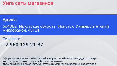 Унга, сеть магазинов по адресу 664082, Иркутская область, Иркутск, Университетский микрорайон, 43/14 в дальнейшем Организация, размещена в следующих категориях: