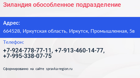 Зиландия, обособленное подразделение по адресу 664528, Иркутская область, Иркутск, Промышленная, 5в в дальнейшем Организация, размещена в следующих категориях: