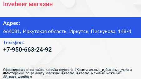 lovebeer, магазин по адресу 664081, Иркутская область, Иркутск, Пискунова, 148/4 в дальнейшем Организация, размещена в следующих категориях:
