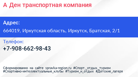 А-Ден, транспортная компания по адресу 664019, Иркутская область, Иркутск, Братская, 2/1 в дальнейшем Организация, размещена в следующих категориях: