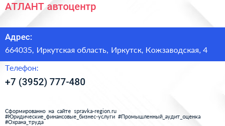 АТЛАНТ, автоцентр по адресу 664035, Иркутская область, Иркутск, Кожзаводская, 4 в дальнейшем Организация, размещена в следующих категориях:
