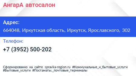 АнгарА, автосалон по адресу 664048, Иркутская область, Иркутск, Ярославского, 302 в дальнейшем Организация, размещена в следующих категориях: