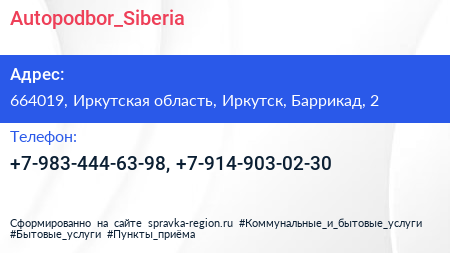 Autopodbor_Siberia по адресу 664019, Иркутская область, Иркутск, Баррикад, 2 в дальнейшем Организация, размещена в следующих категориях: