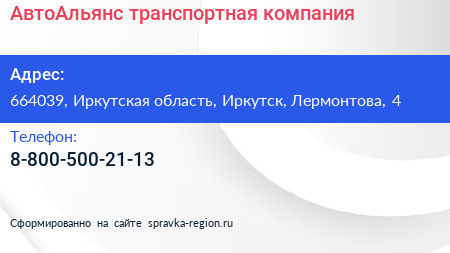 АвтоАльянс, транспортная компания по адресу 664039, Иркутская область, Иркутск, Лермонтова, 4 в дальнейшем Организация, размещена в следующих категориях: