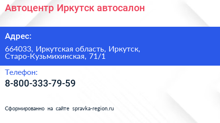 Автоцентр Иркутск, автосалон по адресу 664033, Иркутская область, Иркутск, Старо-Кузьмихинская, 71/1 в дальнейшем Организация, размещена в следующих категориях: