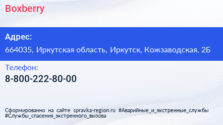 Boxberry по адресу 664035, Иркутская область, Иркутск, Кожзаводская, 2Б в дальнейшем Организация, размещена в следующих категориях: