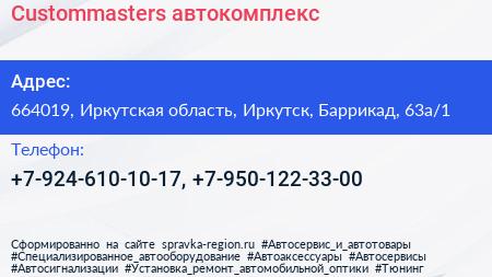 Custommasters, автокомплекс по адресу 664019, Иркутская область, Иркутск, Баррикад, 63а/1 в дальнейшем Организация, размещена в следующих категориях: