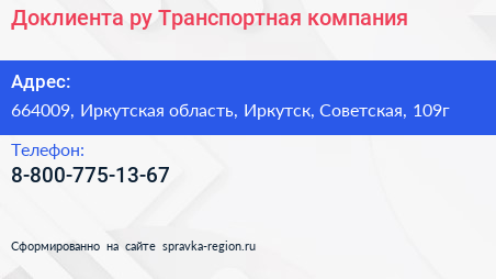 Доклиента.ру, Транспортная компания по адресу 664009, Иркутская область, Иркутск, Советская, 109г в дальнейшем Организация, размещена в следующих категориях: