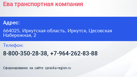 Ева, транспортная компания по адресу 664025, Иркутская область, Иркутск, Цесовская Набережная, 2 в дальнейшем Организация, размещена в следующих категориях: