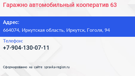 Гаражно-автомобильный кооператив №63 по адресу 664074, Иркутская область, Иркутск, Гоголя, 94 в дальнейшем Организация, размещена в следующих категориях: