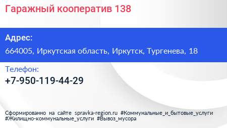 Гаражный кооператив №138 по адресу 664005, Иркутская область, Иркутск, Тургенева, 18 в дальнейшем Организация, размещена в следующих категориях: