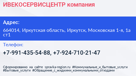 ИВЕКОСЕРВИСЦЕНТР, компания по адресу 664014, Иркутская область, Иркутск, Московская 1-я, 1а ст1 в дальнейшем Организация, размещена в следующих категориях: