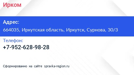 Ирком по адресу 664035, Иркутская область, Иркутск, Сурнова, 30/3 в дальнейшем Организация, размещена в следующих категориях: