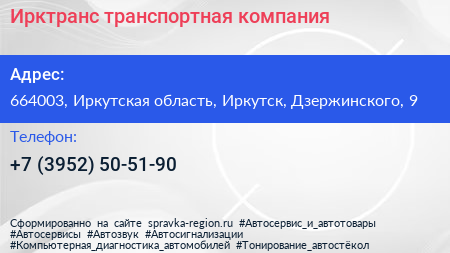Ирктранс, транспортная компания по адресу 664003, Иркутская область, Иркутск, Дзержинского, 9 в дальнейшем Организация, размещена в следующих категориях: