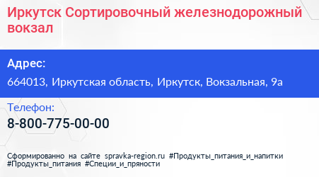 Иркутск-Сортировочный, железнодорожный вокзал по адресу 664013, Иркутская область, Иркутск, Вокзальная, 9а в дальнейшем Организация, размещена в следующих категориях: