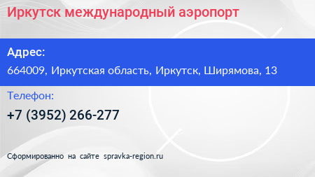 Иркутск, международный аэропорт по адресу 664009, Иркутская область, Иркутск, Ширямова, 13 в дальнейшем Организация, размещена в следующих категориях: