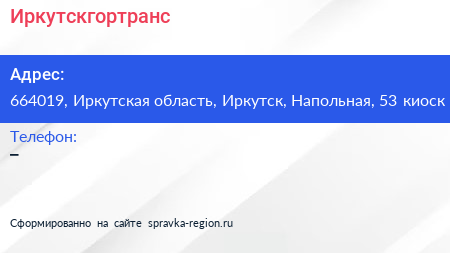 Иркутскгортранс по адресу 664019, Иркутская область, Иркутск, Напольная, 53 киоск в дальнейшем Организация, размещена в следующих категориях: