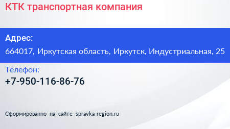 КТК, транспортная компания по адресу 664017, Иркутская область, Иркутск, Индустриальная, 25 в дальнейшем Организация, размещена в следующих категориях: