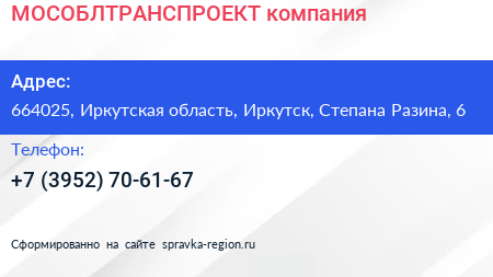 МОСОБЛТРАНСПРОЕКТ, компания по адресу 664025, Иркутская область, Иркутск, Степана Разина, 6 в дальнейшем Организация, размещена в следующих категориях:
