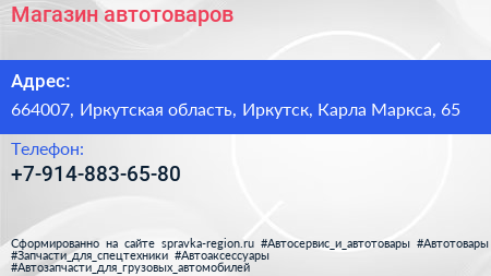 Магазин автотоваров по адресу 664007, Иркутская область, Иркутск, Карла Маркса, 65 в дальнейшем Организация, размещена в следующих категориях:
