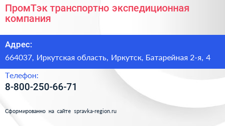 ПромТэк, транспортно-экспедиционная компания по адресу 664037, Иркутская область, Иркутск, Батарейная 2-я, 4 в дальнейшем Организация, размещена в следующих категориях: