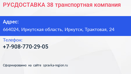 РУСДОСТАВКА 38, транспортная компания по адресу 664024, Иркутская область, Иркутск, Трактовая, 24 в дальнейшем Организация, размещена в следующих категориях: