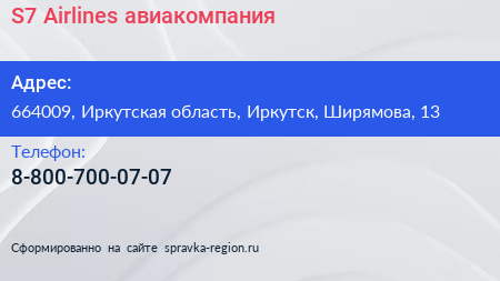 S7 Airlines, авиакомпания по адресу 664009, Иркутская область, Иркутск, Ширямова, 13 в дальнейшем Организация, размещена в следующих категориях: