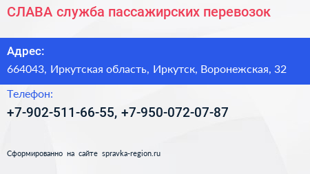 СЛАВА, служба пассажирских перевозок по адресу 664043, Иркутская область, Иркутск, Воронежская, 32 в дальнейшем Организация, размещена в следующих категориях: