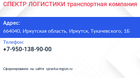 СПЕКТР ЛОГИСТИКИ, транспортная компания по адресу 664040, Иркутская область, Иркутск, Тухачевского, 1Б в дальнейшем Организация, размещена в следующих категориях: