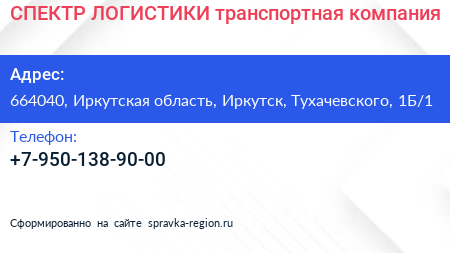 СПЕКТР ЛОГИСТИКИ, транспортная компания по адресу 664040, Иркутская область, Иркутск, Тухачевского, 1Б/1 в дальнейшем Организация, размещена в следующих категориях: