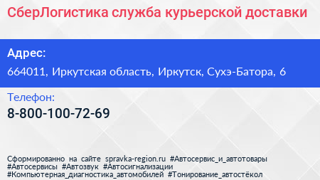 СберЛогистика, служба курьерской доставки по адресу 664011, Иркутская область, Иркутск, Сухэ-Батора, 6 в дальнейшем Организация, размещена в следующих категориях: