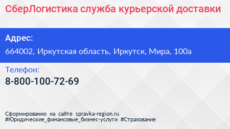 СберЛогистика, служба курьерской доставки по адресу 664002, Иркутская область, Иркутск, Мира, 100а в дальнейшем Организация, размещена в следующих категориях: