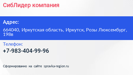 СибЛидер, компания по адресу 664040, Иркутская область, Иркутск, Розы Люксембург, 198в в дальнейшем Организация, размещена в следующих категориях: