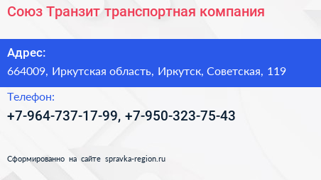 Союз Транзит, транспортная компания по адресу 664009, Иркутская область, Иркутск, Советская, 119 в дальнейшем Организация, размещена в следующих категориях: