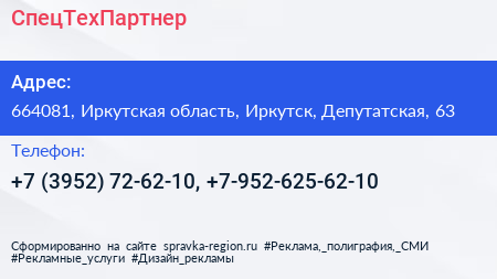 СпецТехПартнер по адресу 664081, Иркутская область, Иркутск, Депутатская, 63 в дальнейшем Организация, размещена в следующих категориях: