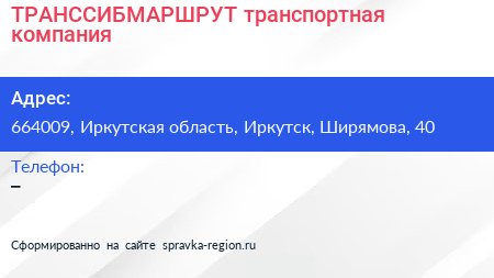 ТРАНССИБМАРШРУТ, транспортная компания по адресу 664009, Иркутская область, Иркутск, Ширямова, 40 в дальнейшем Организация, размещена в следующих категориях: