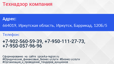 Технадзор, компания по адресу 664019, Иркутская область, Иркутск, Баррикад, 120Б/5 в дальнейшем Организация, размещена в следующих категориях: