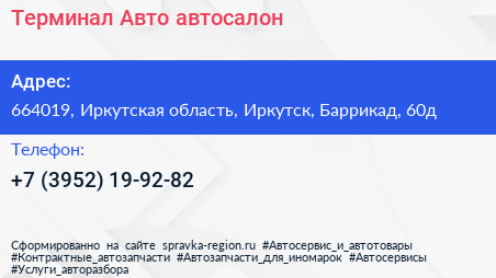Терминал Авто, автосалон по адресу 664019, Иркутская область, Иркутск, Баррикад, 60д в дальнейшем Организация, размещена в следующих категориях: