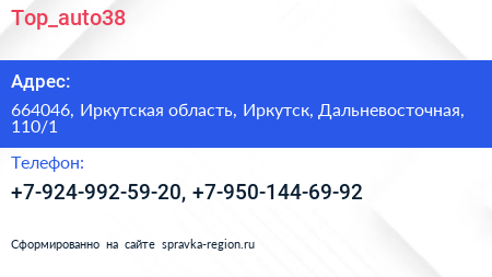 Top_auto38 по адресу 664046, Иркутская область, Иркутск, Дальневосточная, 110/1 в дальнейшем Организация, размещена в следующих категориях: